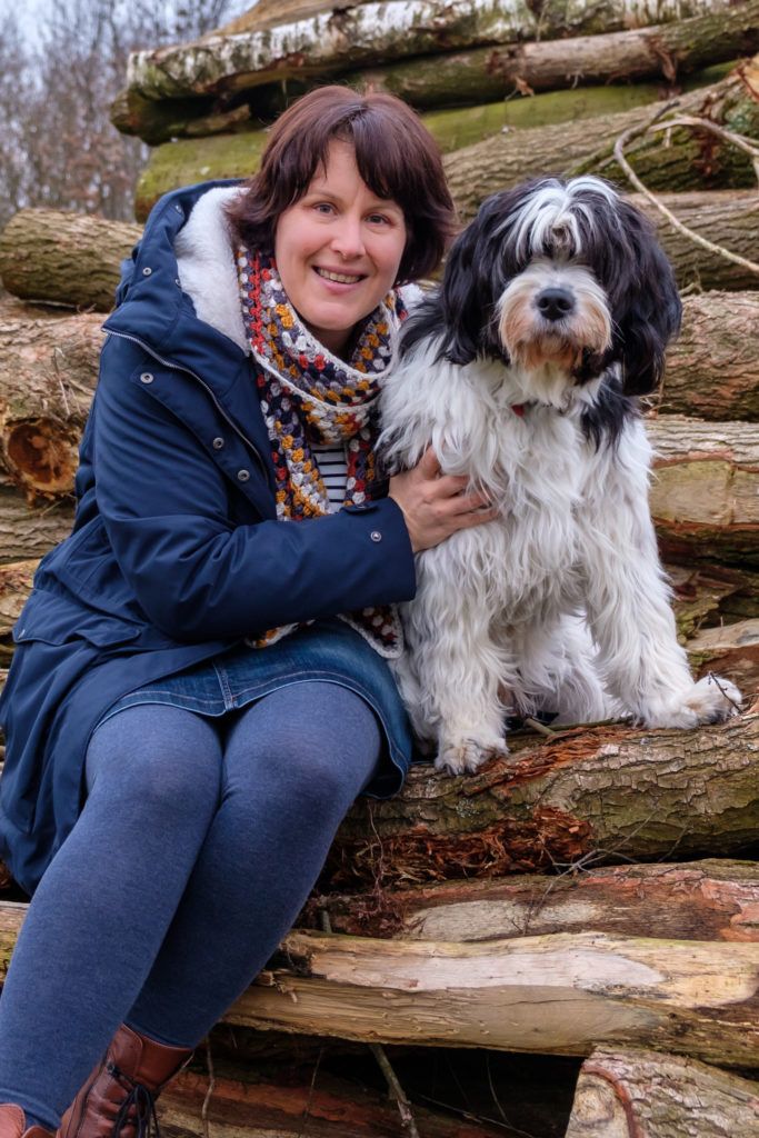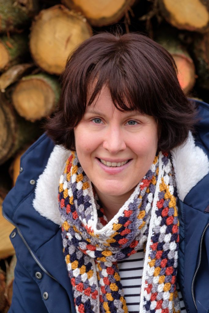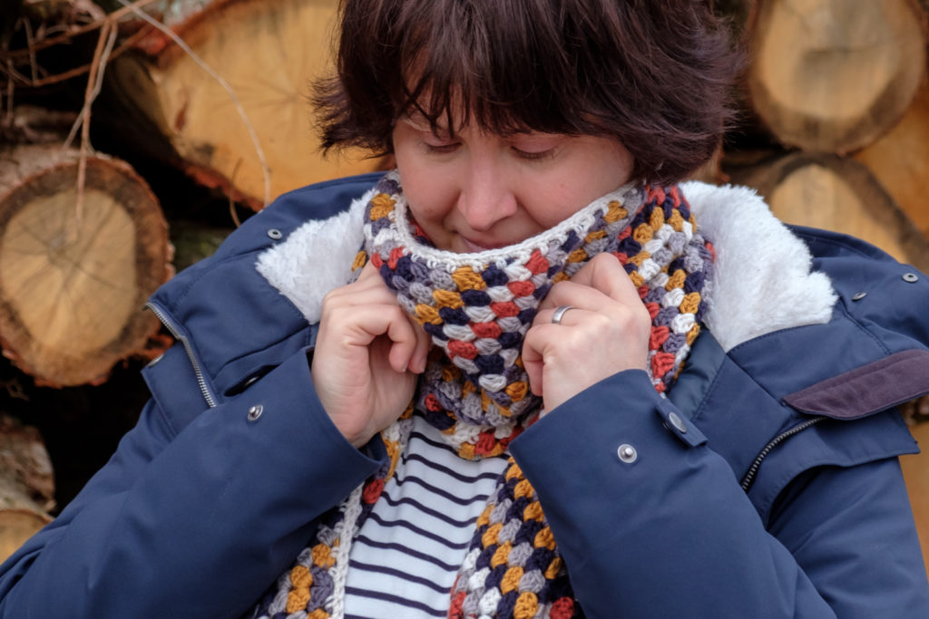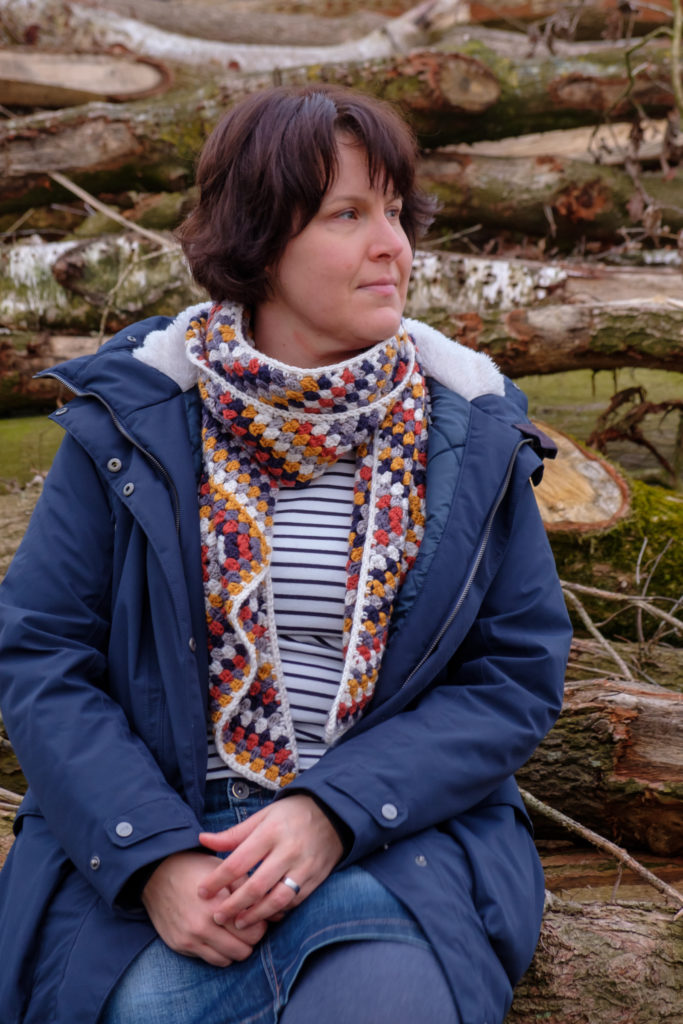 My warm granny stripe scarf is ready to be taken out! We did a little photo shoot during one of the dog walks. A large pile of tree trunks always makes for a pretty backdrop, don’t you think?